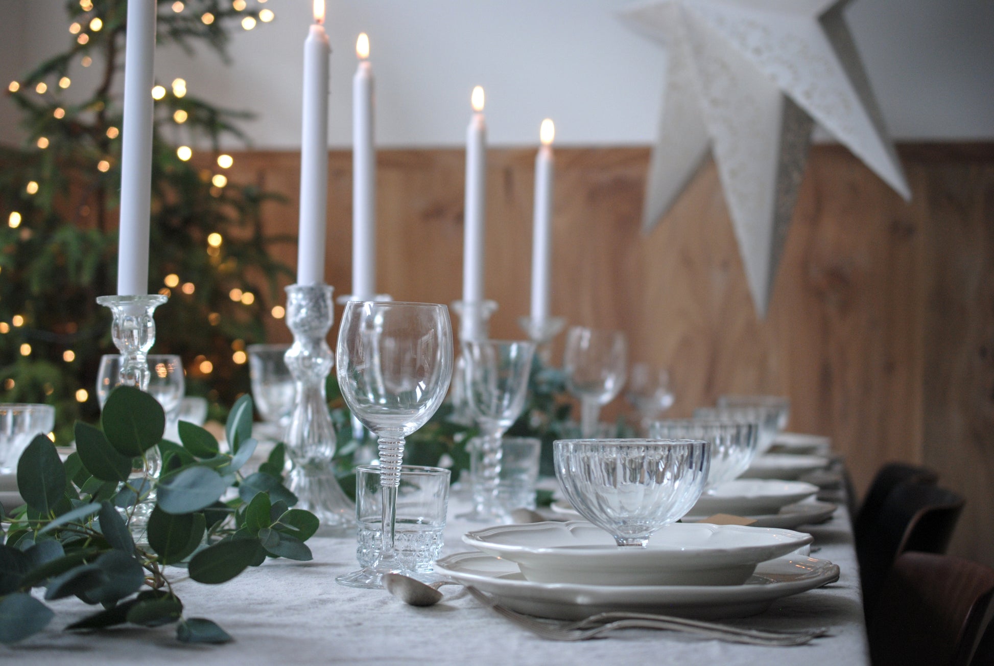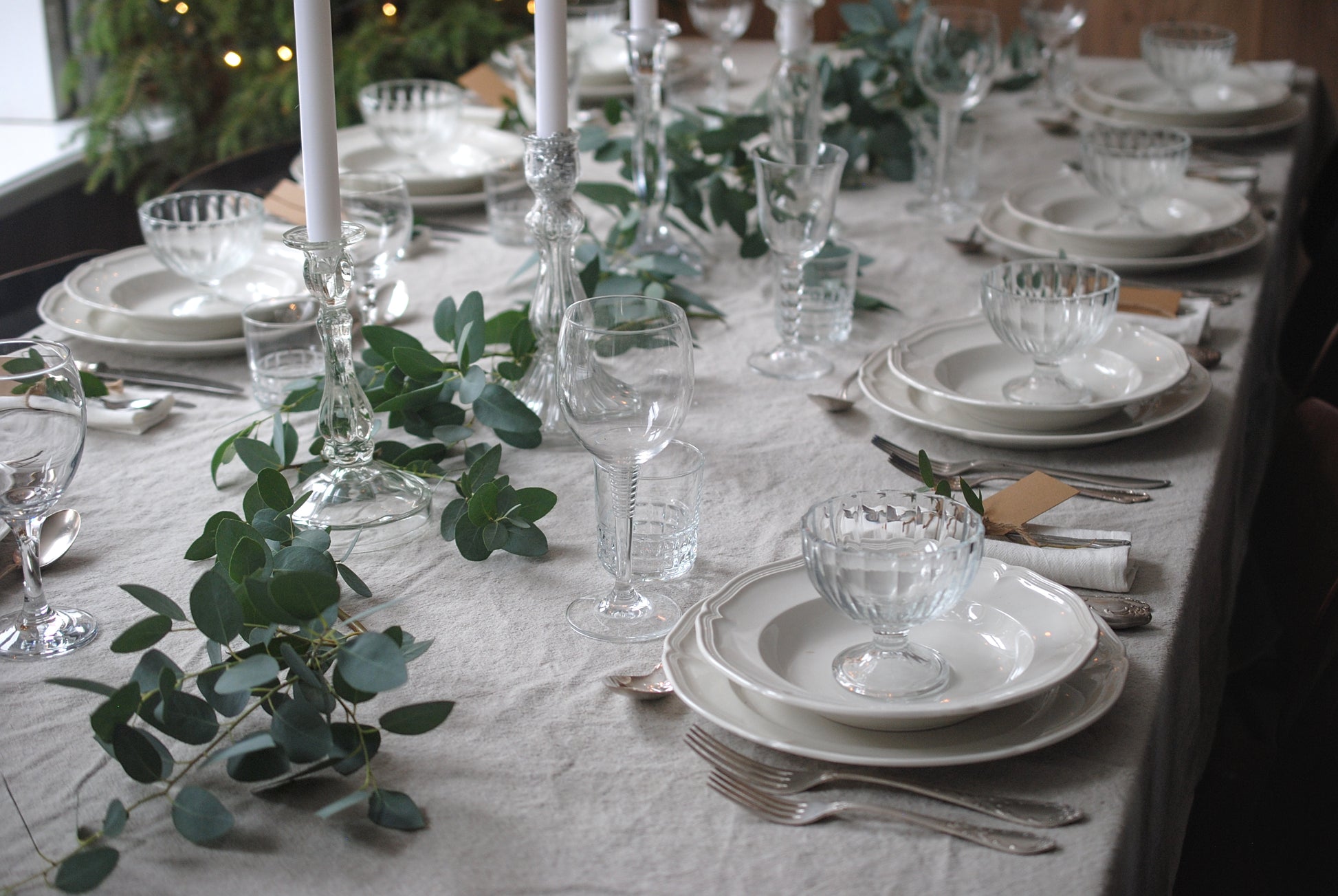 Een tafel in klassieke kerstsfeer: luxe witte borden, transparant glaswerk en sierlijk zilverkleurig bestek op zandkleurig tafellinnen. Natuurlijk kerstgroen brengt de tafel tot leven en de hoge dinerkaarsen maken het feestelijk.