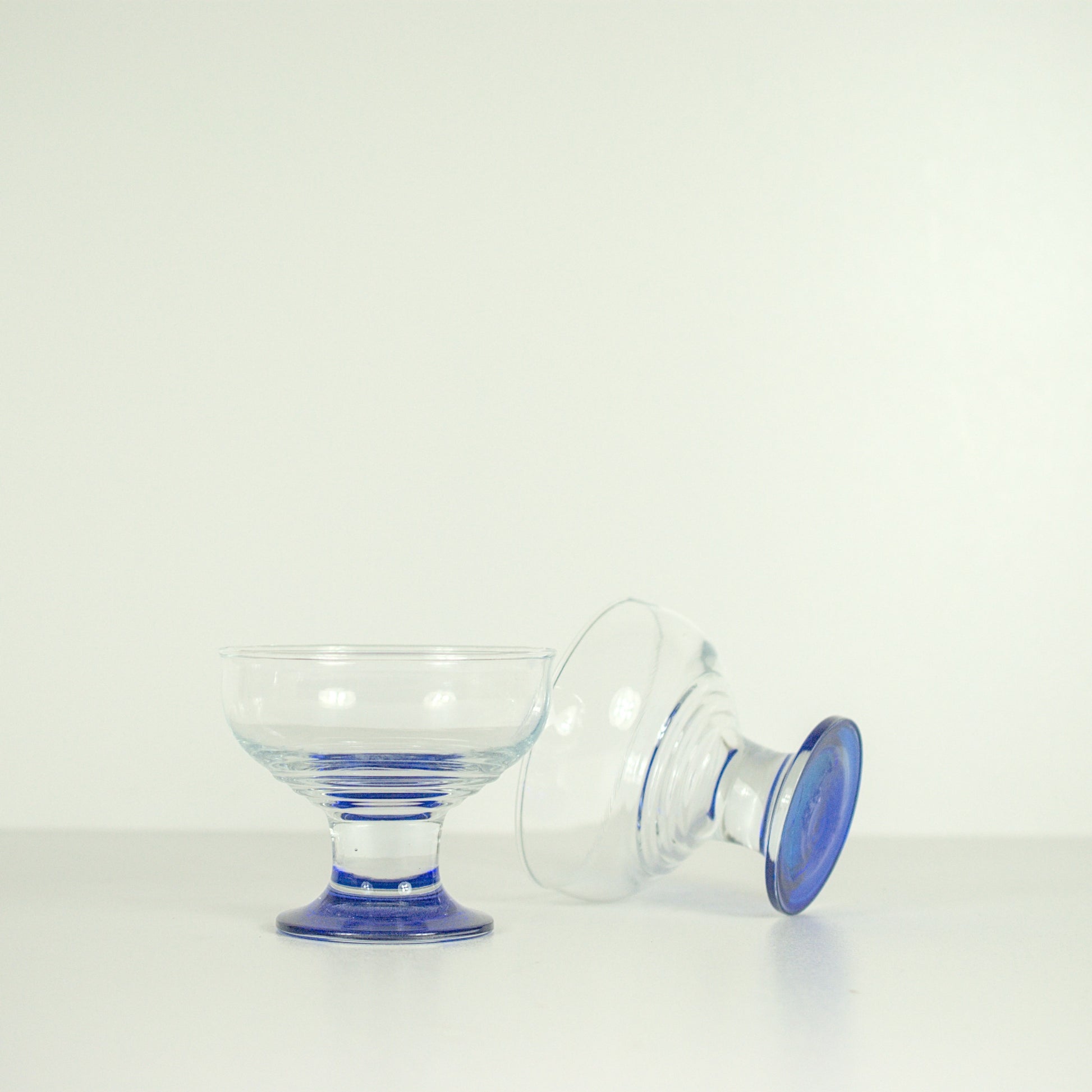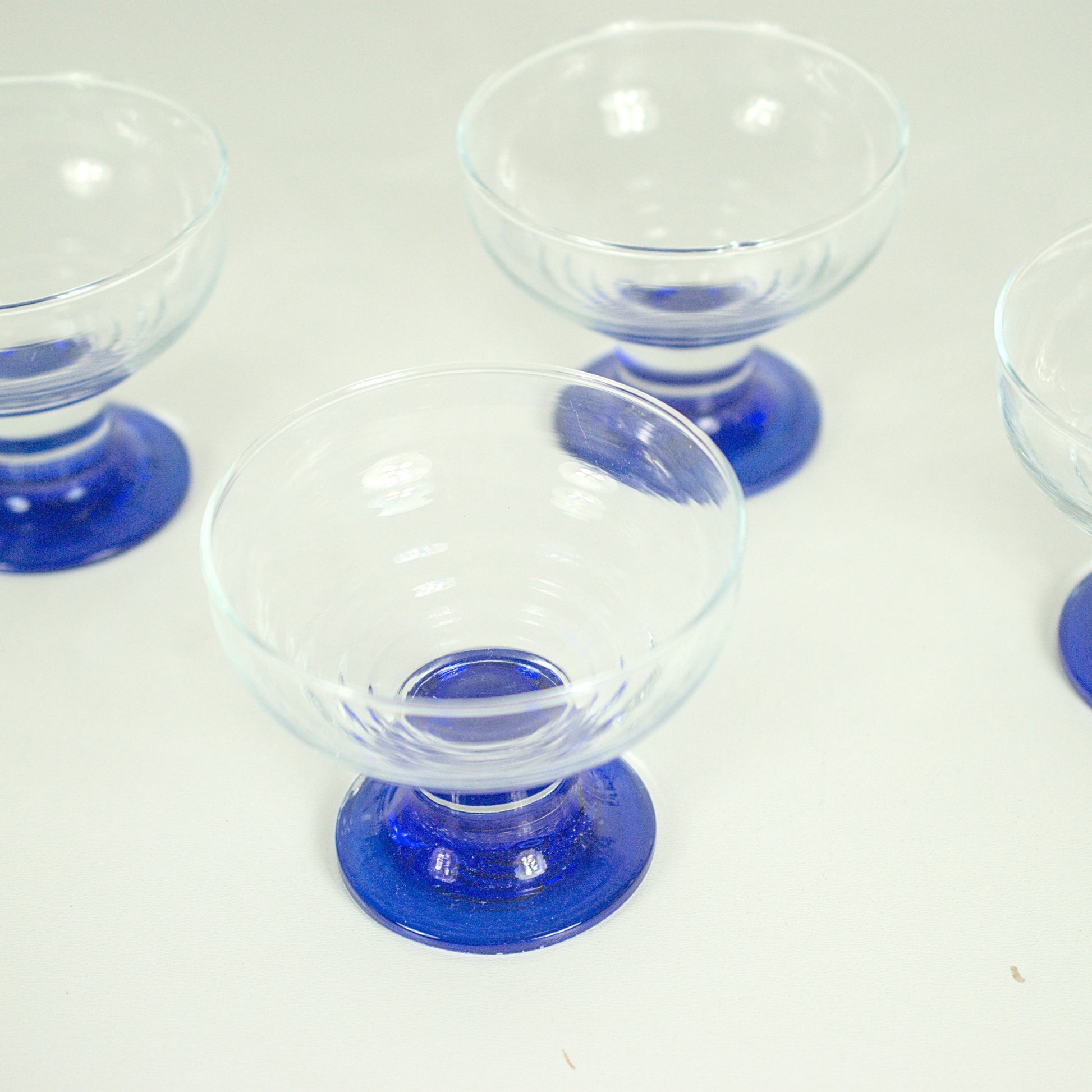 Set van 4 vintage coupes. De glazen coupes zijn transparant met een kobaltblauwe voet. Ideaal voor het serveren van ijs of ander dessert.
