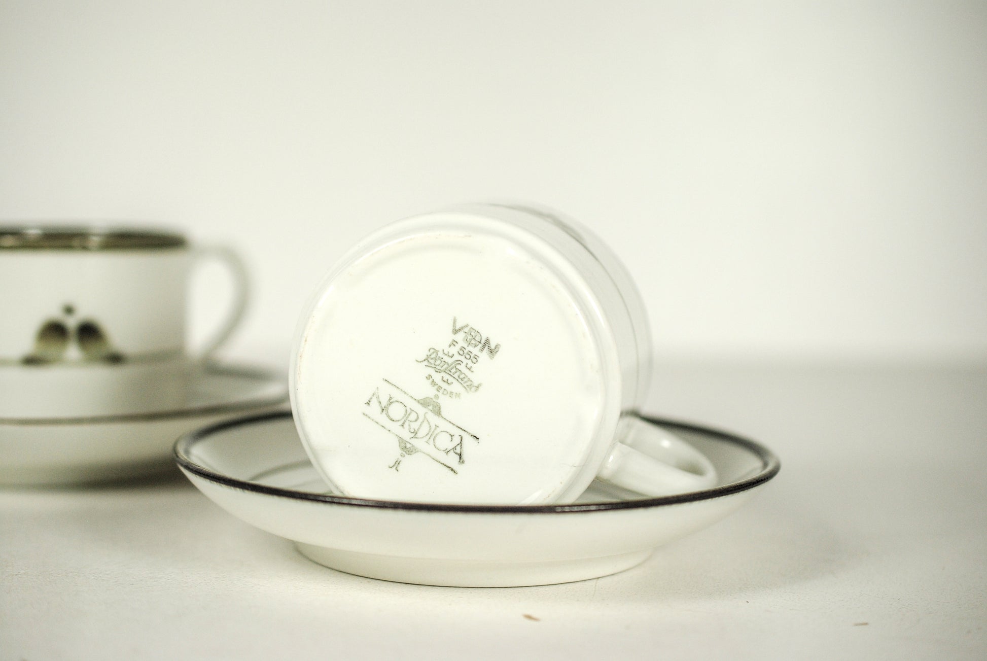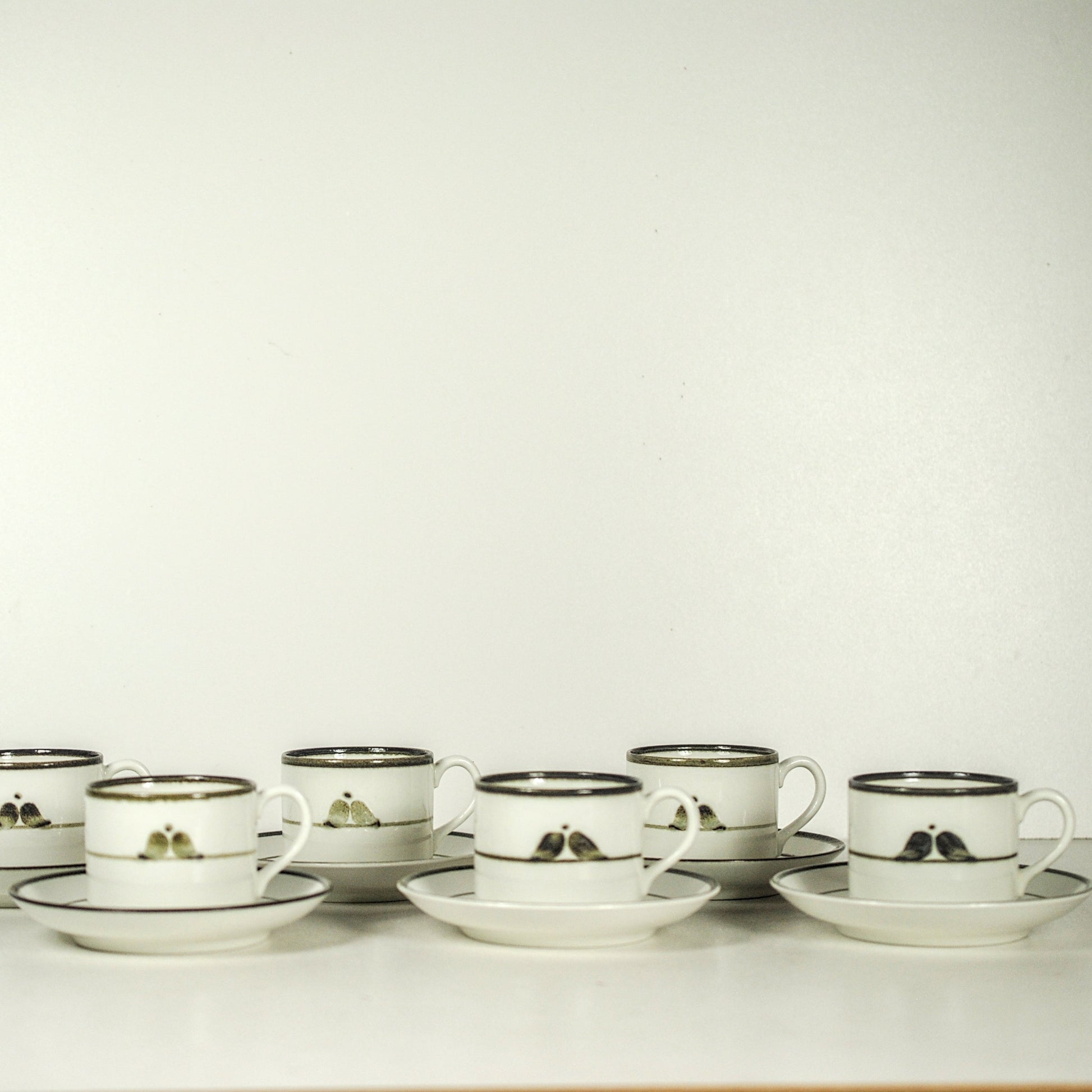Set van 6 kop&schotels uit de serie "Nordica" van het Zweedse Rörstrand. Het servies is wit met olijfgroene tekening. De serie is in de jaren 70 ontworpen door Carl Harry Stalhane en Jaqueline Lund.