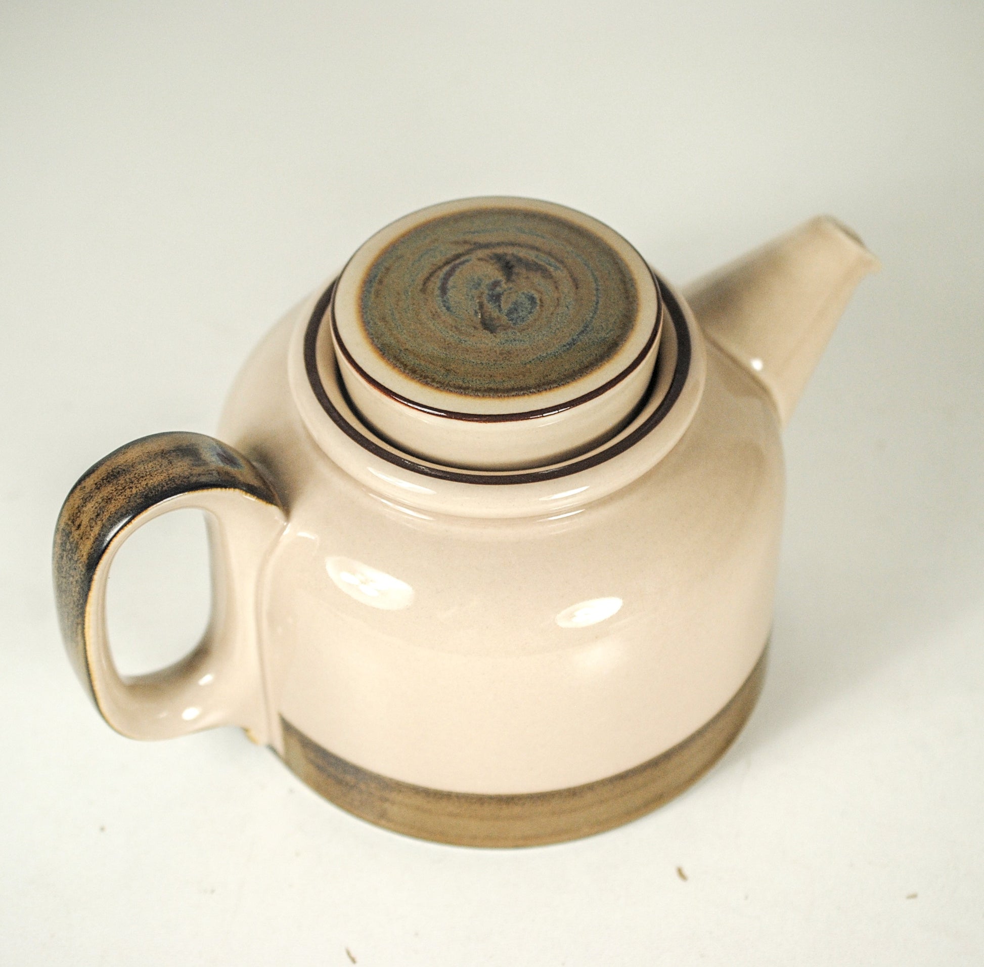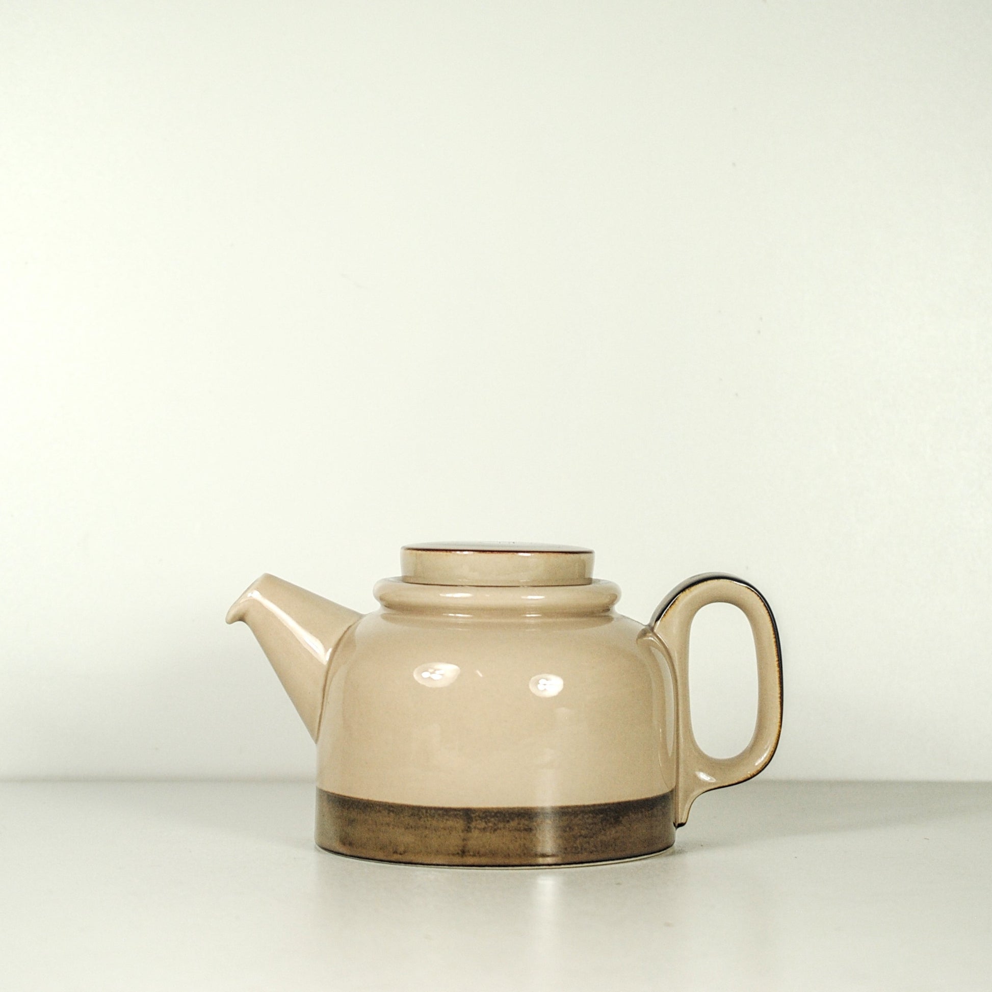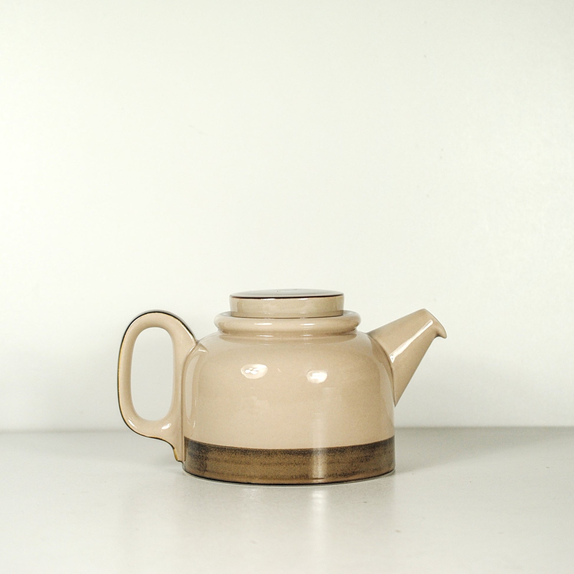 Vintage koffie/theepot uit de geliefde Peru-serie van het Deense Bing & Grøndahl. Het Peru-servies heeft een warme, beige tint met brede bruine accenten. De serie is in de jaren 60 ontworpen door Jens Harald Quistgaard.