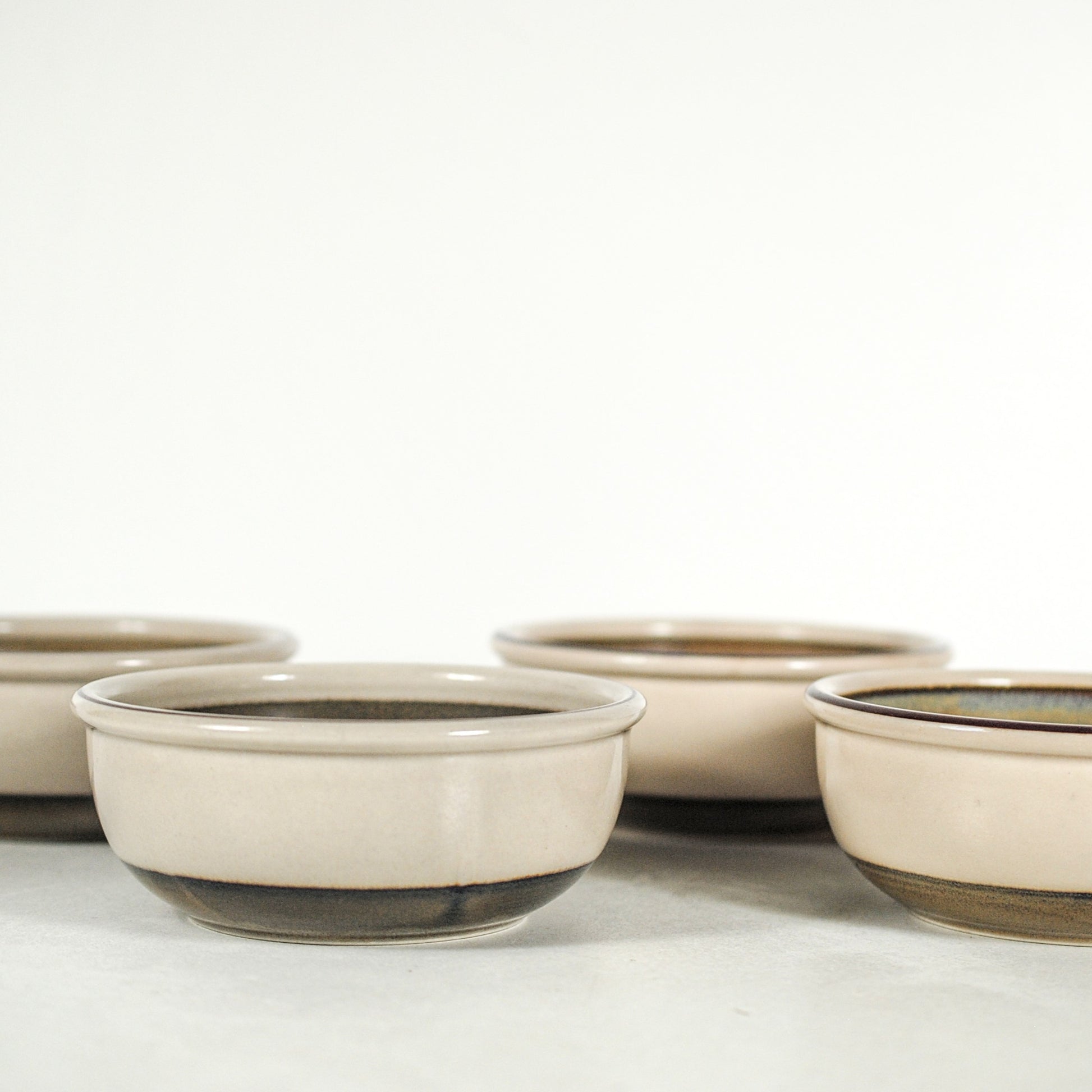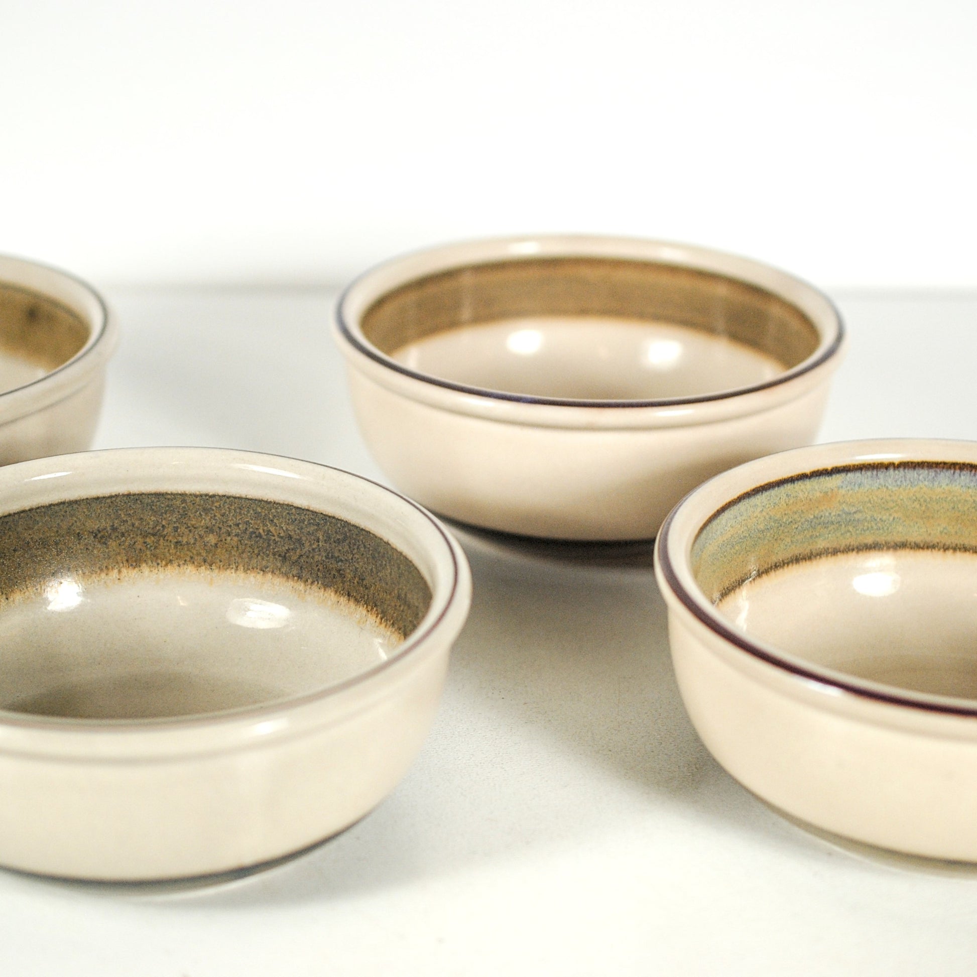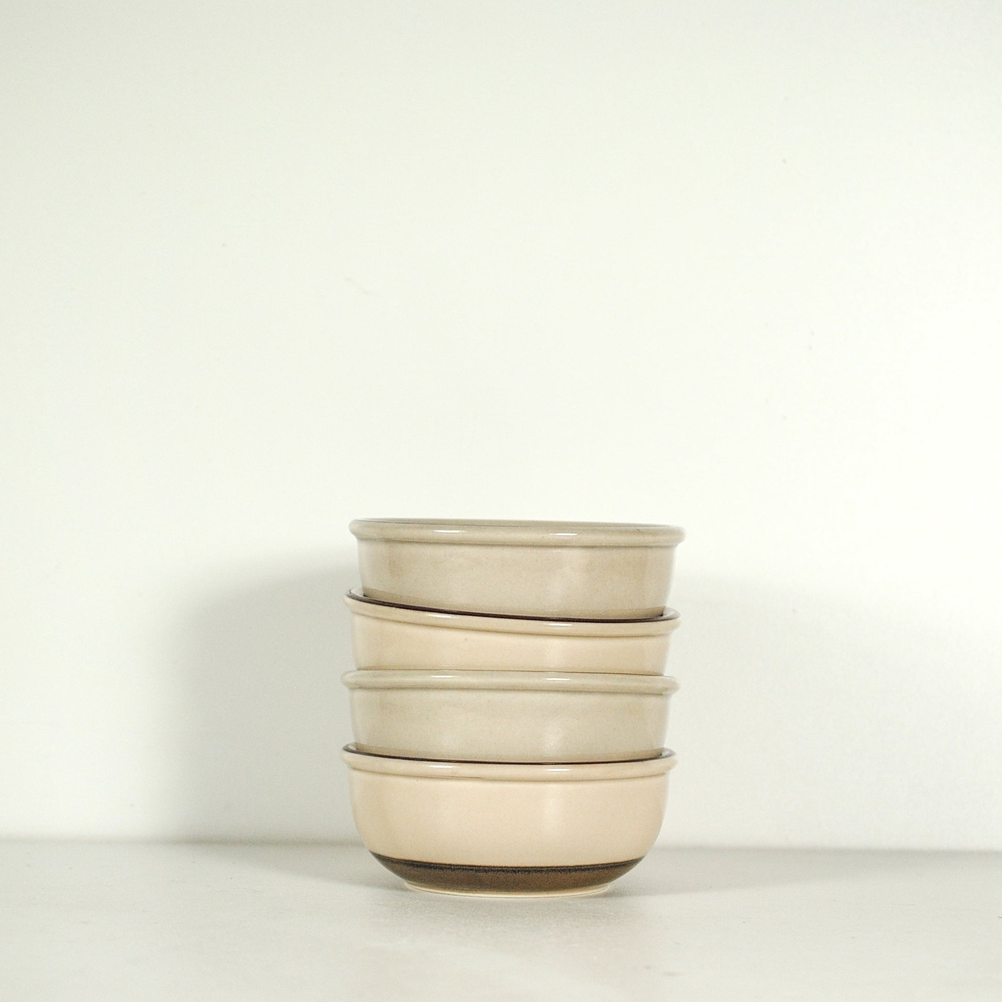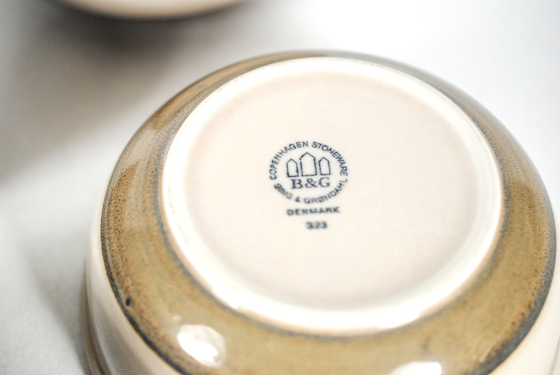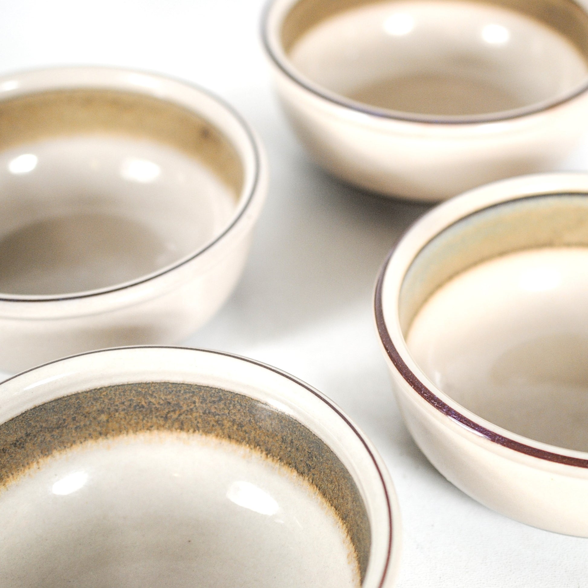 Set van 4 vintage kommetjes uit de geliefde Peru-serie van het Deense Bing & Grøndahl. Het Peru-servies heeft een warme, beige tint met brede bruine accenten. De serie is in de jaren 60 ontworpen door Jens Harald Quistgaard.